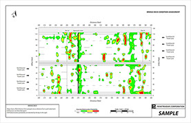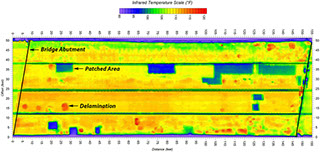 Penetradar has developed a new technique utilizing advanced image processing for generating plan-view maps which accurately show defects and other features of the bridge deck. Delaminations are seen in red, patches as blue and lane lines and abutments are clearly observed.